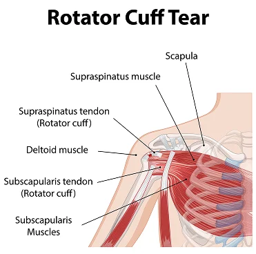 The rotator cuff is a group of four muscles and tendons that stabilize your shoulder joint and help with lifting and rotating the arm. When these tendons are strained, torn, or inflamed, it leads to pain, weakness, and limited motion.